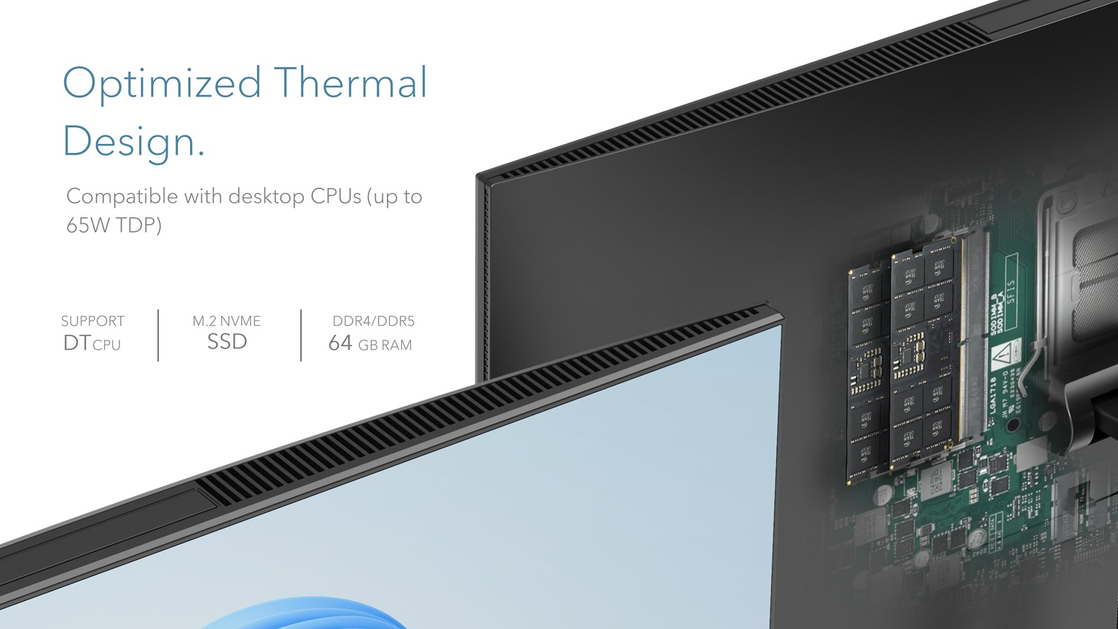 Flexible CPUCompatible with Intel/AMD, mobile or desktop CPUs. Thermal module supports up to 65W CPUs.